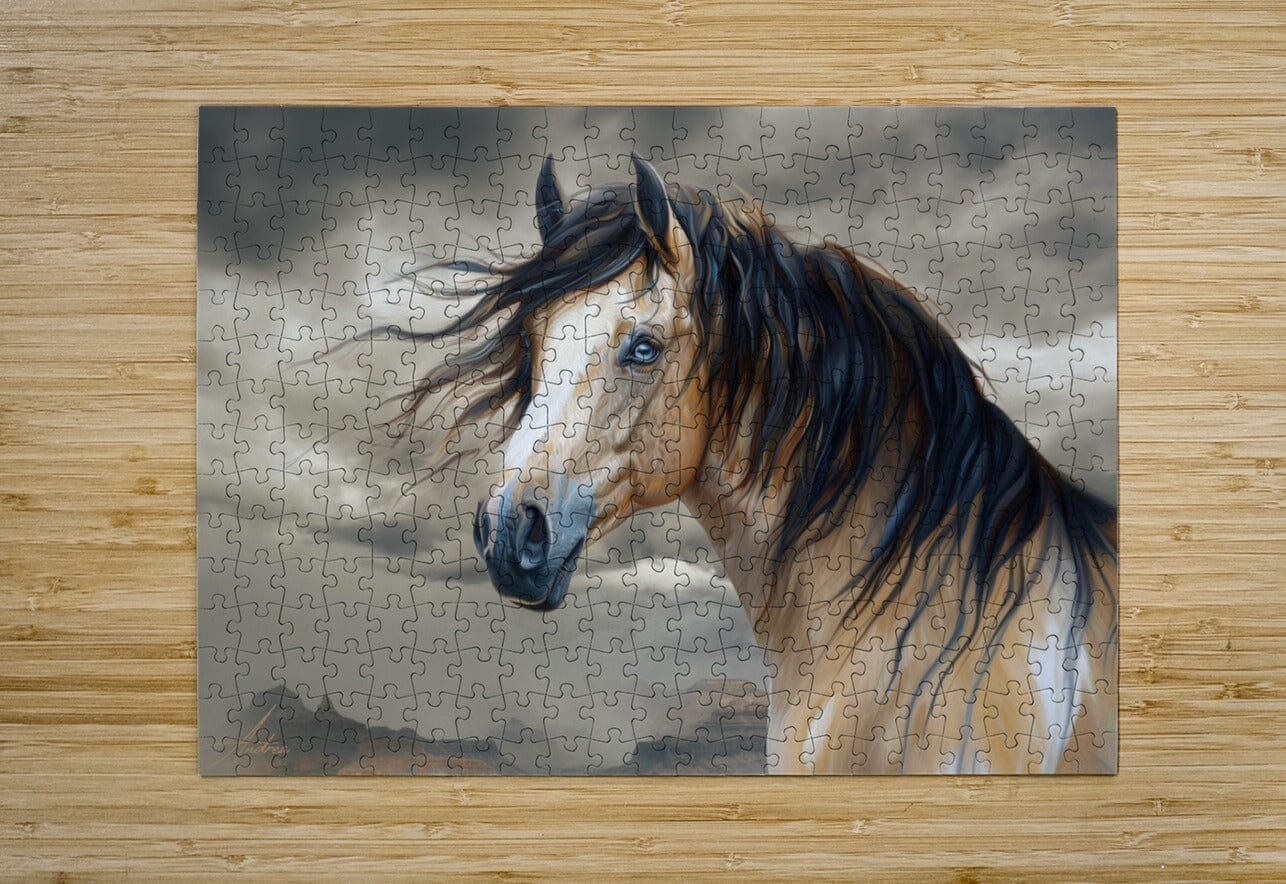 Tallulah Blue Eyed Buckskin features a gorgeous blue-eyed Buckskin Morgan mare as she scans the canyon landscape she freely roams on, on a cool, windy morning. A storm looms in the foggy distance.