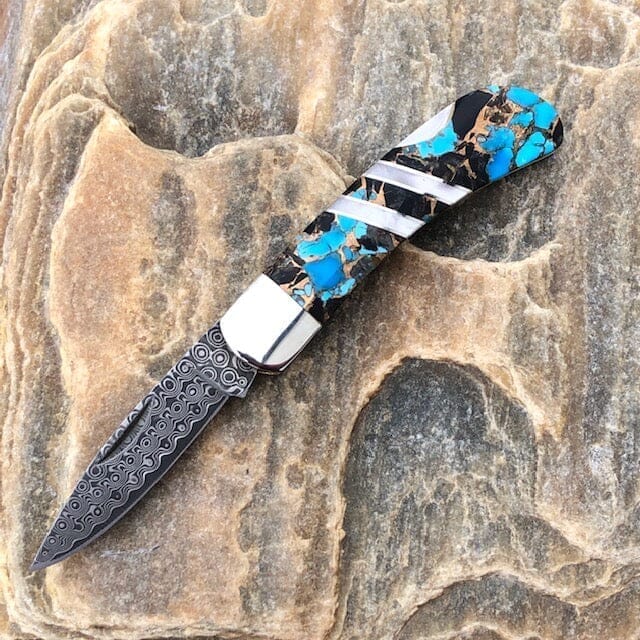 Forgive me if I'm drooling, but this lovely little sweetie has captured my heart! Stunning Blue Kingman Turquoise and Obsidian and Bronze Matrix Knife with a gorgeous Raindrop Damascus Blade! Stocked in single sided. Double-sided turquoise inlay is special order.