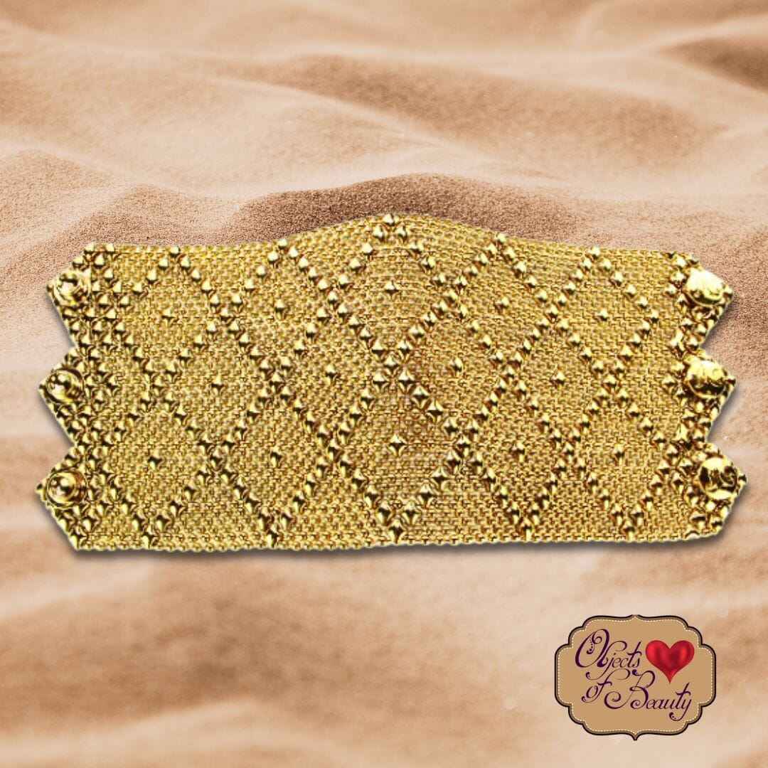 Golden Pandora Antique Gold SG Liquid Metal Bracelet is our reminder of Hope. She lusciously covers the wrist and arm, in diamond mesh patterns dotted with hope. Three snaps fasten one of the widest of all Sergio's Liquid Metal Bracelets.