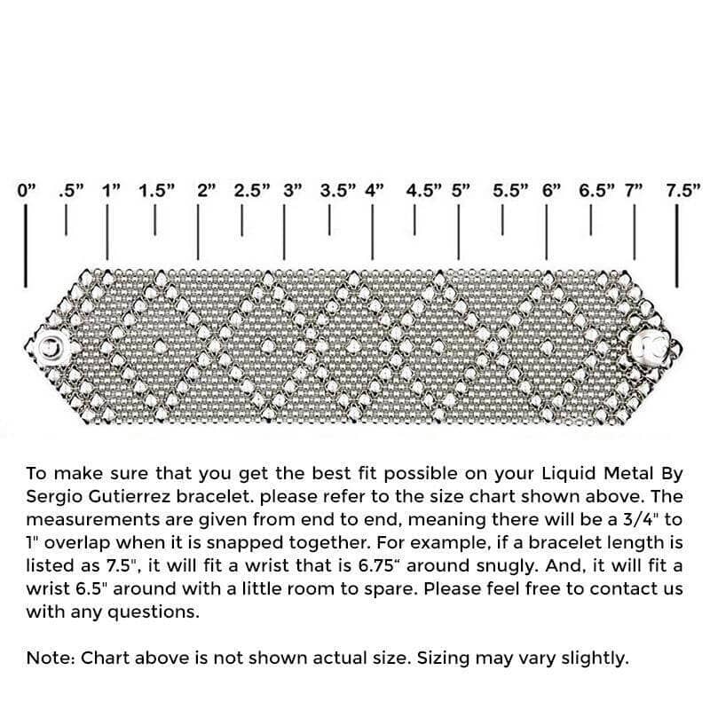 Please measure your wrist before placing your order. Measure above the bump/wrist bone. Order your bracelet one (1) inch more than your wrist measurement. This bracelet overlaps when snapped on, losing 0.5 inches. Liquid Metal Bracelets are measured from tip to tip.