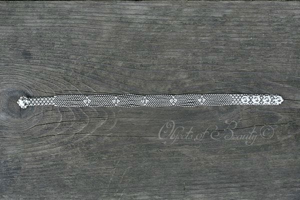 Special order this five diamond patterned choker with chain spaces between each of them. It has a slinky feel.