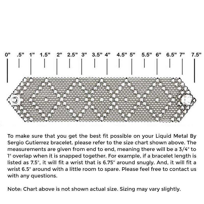 Please measure your wrist before placing your order. Measure above the bump/wrist bone. Order your bracelet one (1) inch more than your wrist measurement. This bracelet overlaps when snapped on, losing 0.5 inches. Liquid Metal Bracelets are measured from tip to tip.
