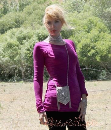 Using a long chain that extends from the top corner, this choker laces up the back by feeding the chain through the loops on each side. Lace it loosely, or tighter to achieve the look you want.