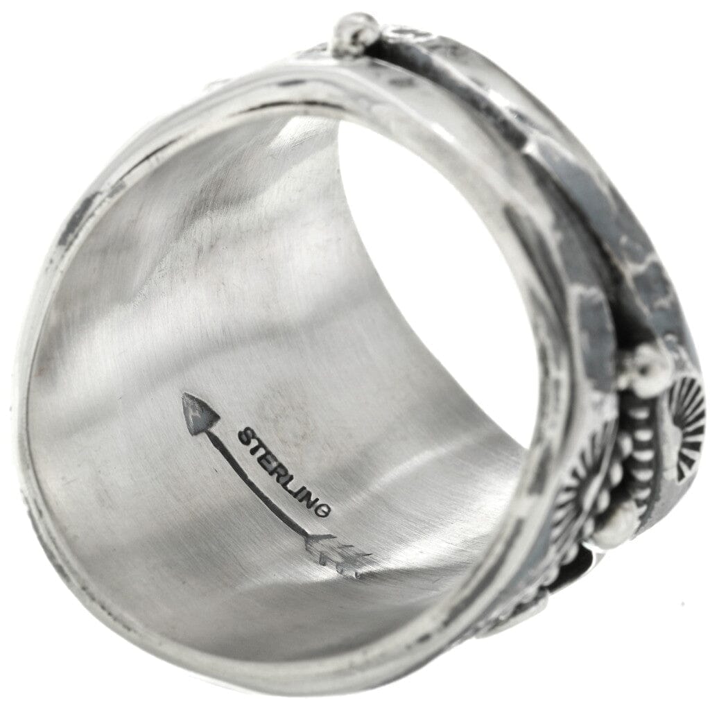 Standing proudly on a deep black, antiqued background, this wild Bison Ring is embellished with silver drops, swirls and hammered fanned horizons. Framed with twisted wire.