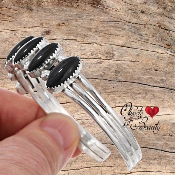 Our Black Onyx Sterling Silver Cuff Bracelet is beautifully crafted by Navajo artist, Verna Blackgoat. Wear alone, or layer this handsome cuff, with its seven genuine Onyx stones that are bezel set in a triple shank Sterling Silver bracelet. Works beautifully with turquoise and solid silver bracelets.