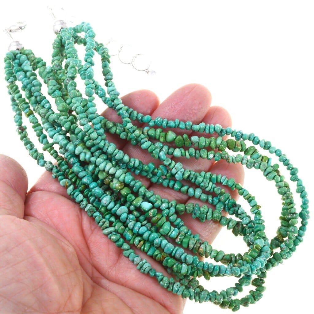 Intense green to aqua hues and earthy browns, our Seven Strand Navajo Bright Green and Blue Turquoise Necklace from our Yellowstone Spirit Southwestern Collection brings earthly and running river hues in abundance!