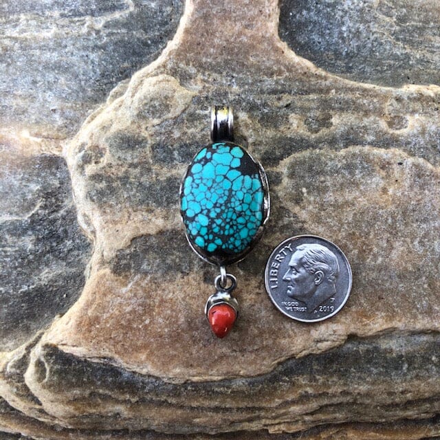 Riddled with a Spider Matrix painting, this sweet little turquoise oval pendant is accented by a drop of red coral! Affordable and small enough for a child to wear.. Hey, what a sweet start to a little person's collection! Also wonderful for the petite person and a great piece to layer with other necklaces.