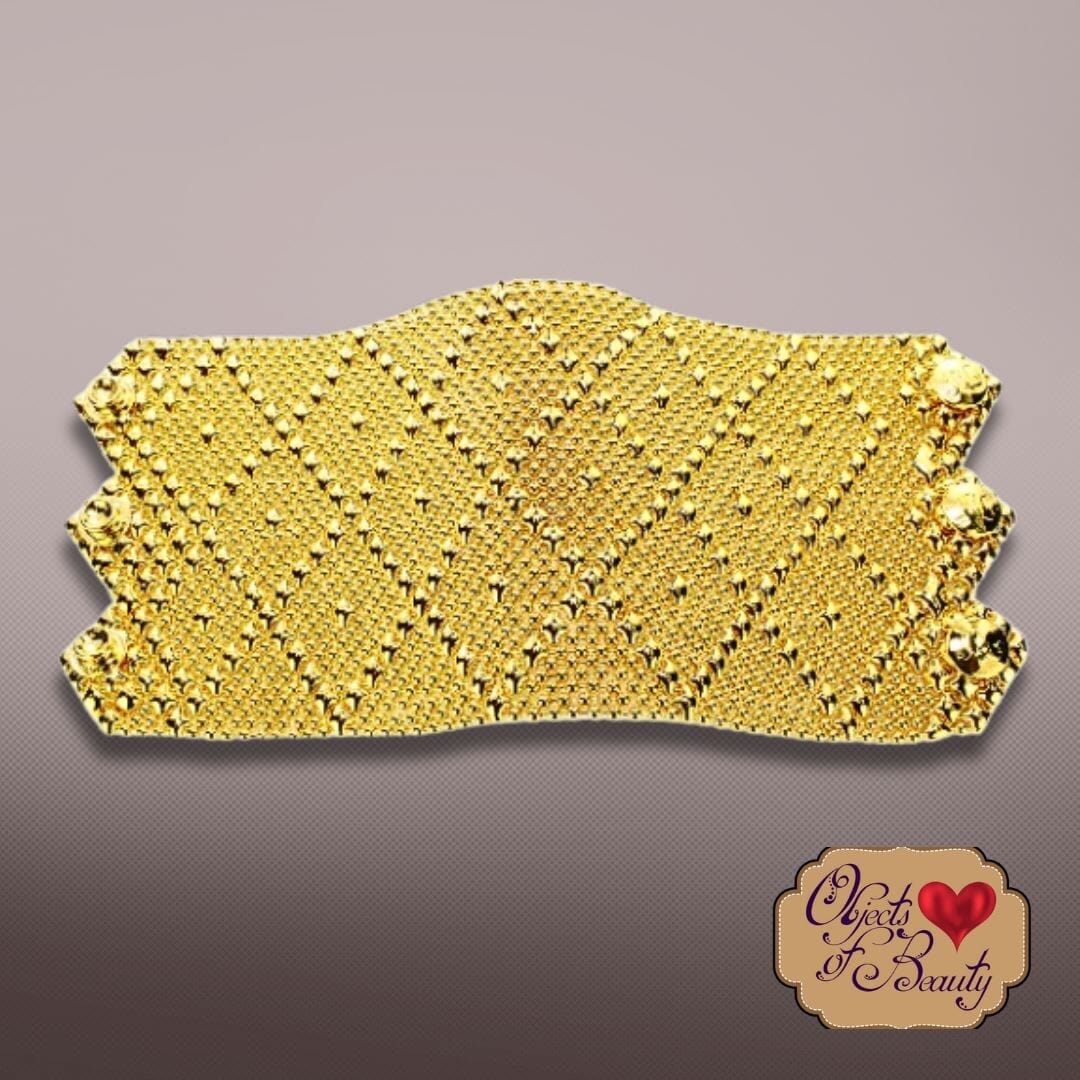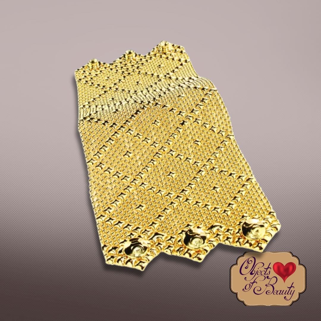 Golden 24K Bright Gold Pandora SG Liquid Metal Bracelet is our reminder of Hope. She lusciously covers the wrist and arm, in diamond mesh patterns dotted with hope. Three snaps fasten one of the widest of all Sergio's Liquid Metal Bracelets.