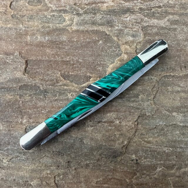 Our handy gentleman's Malachite with Jet Onyx Striped Tuxedo knife is a fabulous pocket or desk knife for everything from whittling to opening letters.
