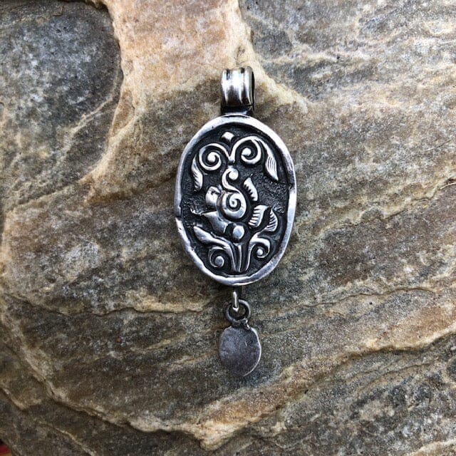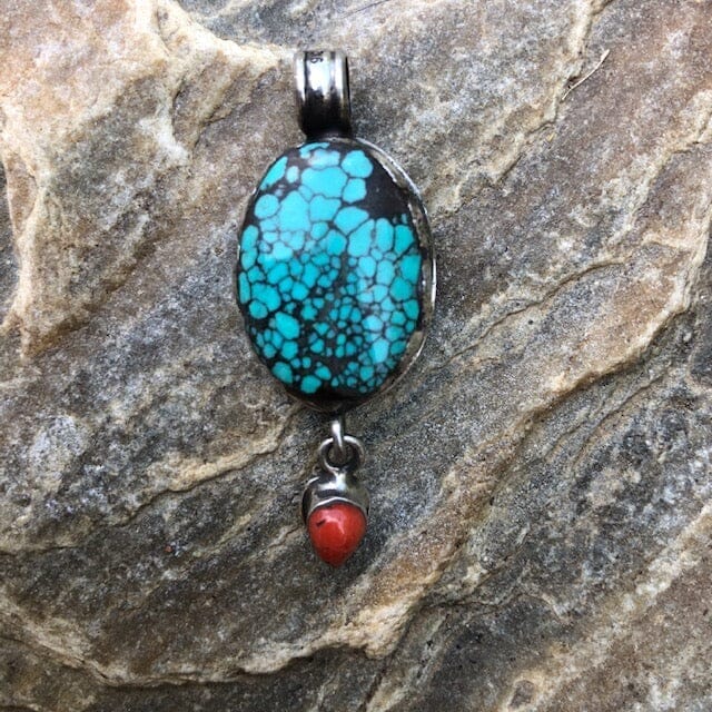 Riddled with a Spider Matrix painting, this sweet little turquoise oval pendant is accented by a drop of red coral! Affordable and small enough for a child to wear.. Hey, what a sweet start to a little person's collection! Also wonderful for the petite person and a great piece to layer with other necklaces.