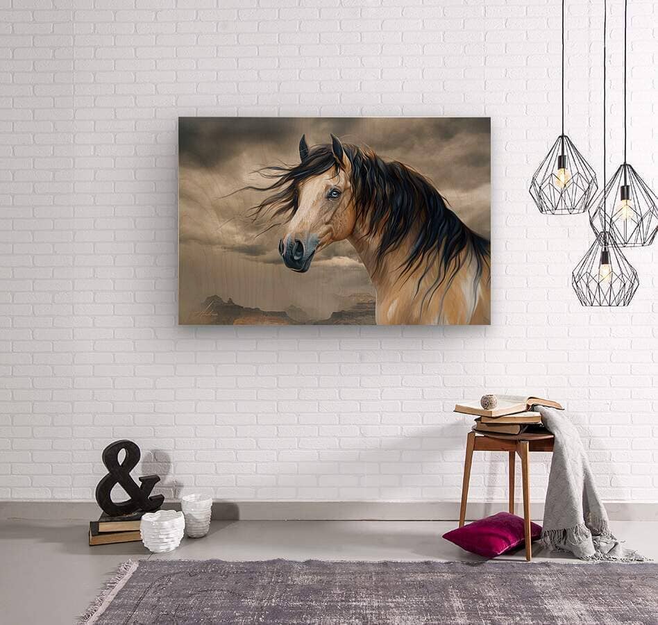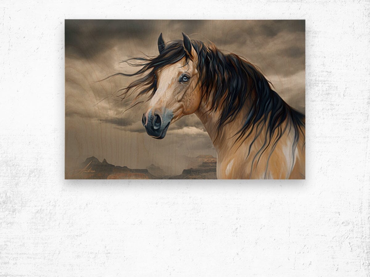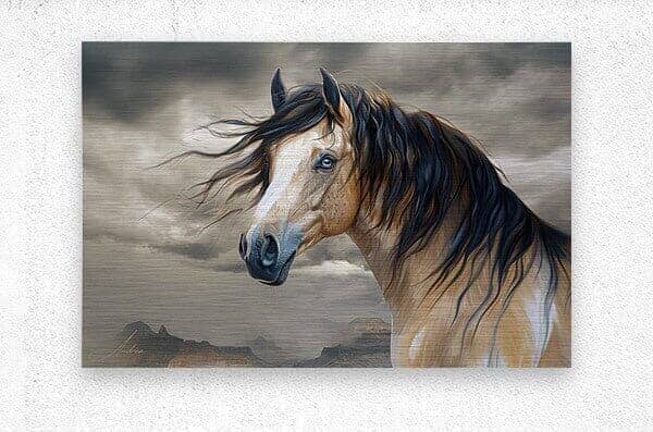 Tallulah Blue Eyed Buckskin features a gorgeous blue-eyed Buckskin Morgan mare as she scans the canyon landscape she freely roams on, on a cool, windy morning. A storm looms in the foggy distance.